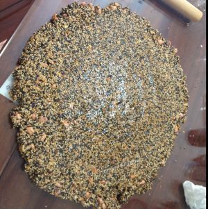 炒出香味 倒在玻璃板上 用擀面杖擀平