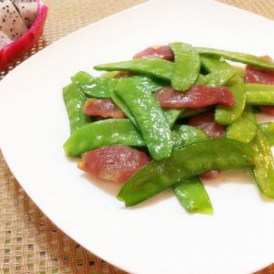 锅中油烧热,放入腊肠煸炒,再放入荷兰豆,加入盐,蚝油大火翻炒,出锅