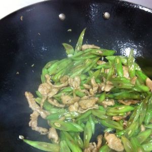 热锅下油,烧至8成热,倒入姜丝煸炒出香味,倒入豆角翻炒。豆角炒熟后烹入生抽和蚝油,再倒入炒好的肉丝翻炒均匀。