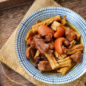 6、闷煮到汤汁剩下一半的时候,我们加入腐竹和少许盐,盖上盖子,让它继续闷煮