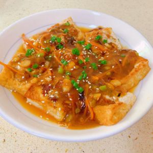 翻面再煎黄后把油倒出,加水、少许酱油闷煮一会儿,豆腐盛出,酱汁导入小碗备用