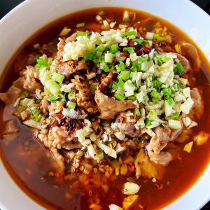 将刀口辣椒、葱蒜末依次放在肉片上,锅中烧油至七成热,将热油泼在葱蒜末上即可食用。