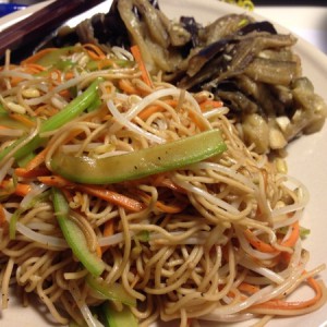 芹菜梗和胡萝卜切细丝,切蒜末下热油锅炒香先放胡萝卜丝炒软再放芹菜丝和豆芽,蔬菜炒软之后放面条,撒盐淋酱油炒匀出锅前放一点点糖。