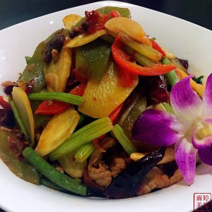 倒入焯烫好的食材翻炒几分钟,调入适量盐、少许味精、鸡精,喜欢吃辣点的加入些辣椒油,OK,可以出锅啦。