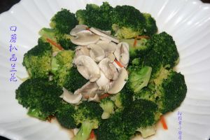 转大火下西兰花、口蘑翻炒至熟,加蘑菇精、盐调味,出锅前加入胡萝卜丝配色,用水淀粉勾薄芡,完成啦!