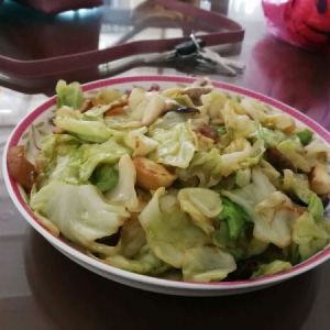 加入包菜翻炒熟,倒入一勺耗油,鸡粉,一勺生抽,适量盐。出锅