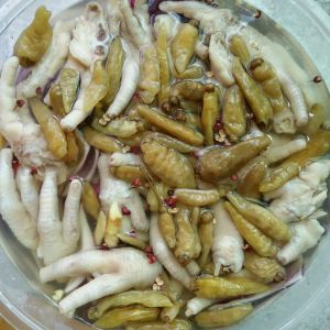 凤爪洗净,去脚趾,放花椒,料酒,生姜,蒜煮15分钟!