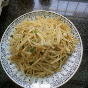 准备两个土豆,去皮后,切成细丝。切好后,用水清洗一下。