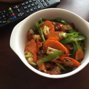 放入大葱段(斜切),胡萝卜片,青椒,开中火炒两下。