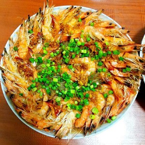 摆好青虾,起锅放油,入蒜末,辣椒碎,炸至金黄,关火倒入耗油,蒸鱼豉油