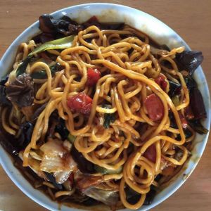 将泡好的大蒜水倒入鍋中,炒至配菜软熟即可倒入面条。