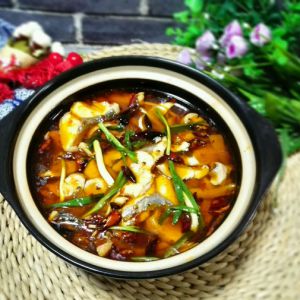 把锅内鱼片和汤汁倒入煲内,上面放入香葱段。