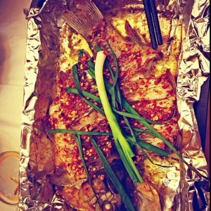 刷子均匀刷上姜汁、蒜汁、花椒面、辣椒面,淋上少量油。
