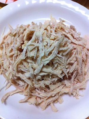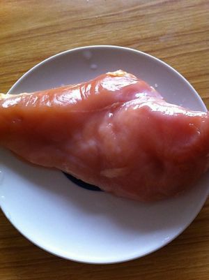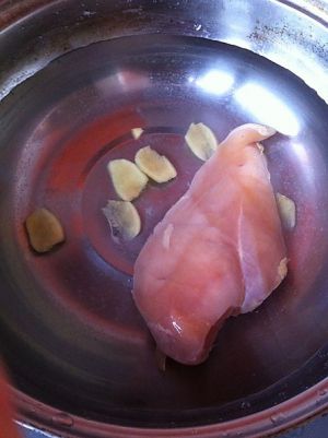 锅中放入清水,姜片和鸡胸肉,一起煮25-30分钟左右,煮的过程中如有浮沫要撇出,筷子札透即可。