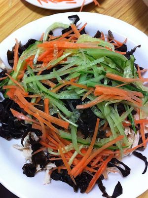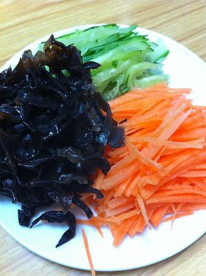 木耳用水浸泡发煮一下切丝,黄瓜和胡萝卜也切丝(维尼刀工不好,因为用瓜皮刀儿先把黄瓜和胡萝卜削成片再切,丝儿就细啦哈哈)