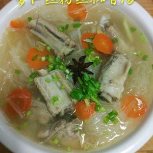 排骨汤盛入汤盆中,轻轻搅匀调料。