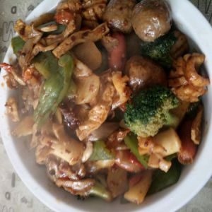把油烧热,放花椒粒10g浓香捞出,放三胡椒油、辣椒粉、孜然粉。再放刚刚煮熟的蔬菜加盐鸡精。就可以出锅了