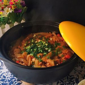 开盖放入葱花,关火,盖上盖子,让砂锅的余热焖会儿。