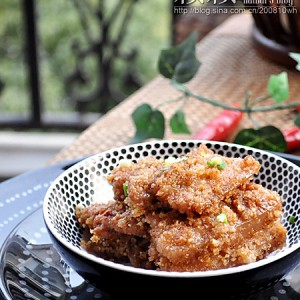 用手抓捏肉片,使其与蒸肉粉及调味料粘裹均匀;