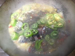 起锅前加入青辣椒,有嫩姜就加嫩姜。