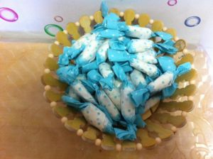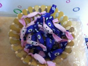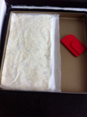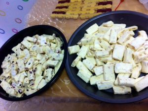 待牛轧糖凉后可以切块,长3cm宽1.3cm高1.5cm,这样比较好包糖纸,当然我也且的不标准