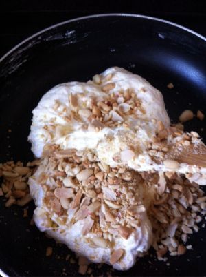 倒入花生碎,也可以同时加入50g蔓越梅干,充分融合
