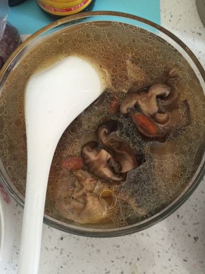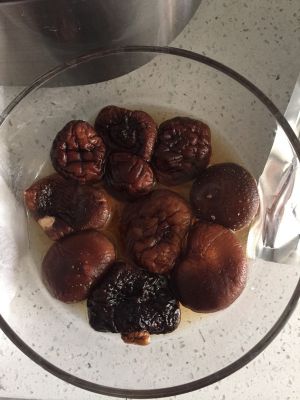 干香菇提前泡发一晚。半碗水都快被吸收干了,泡一晚才能让香菇发的最好