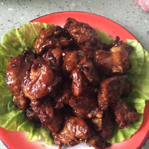 炒糖色,锅中只需要放少量的油就可以了,将冰糖放入锅中,慢火融化到起泡,颜色渐黄就倒入炸好的排骨,让糖充分包裹的排骨,然后倒入再倒入适量的老抽再上一次色,同时加入准备好的蒜,八角小火多炒一会,让颜色固着到肉上,然后加入开水,一定要开水哦,大火5分钟后,改小火焖煮20左右,大火收汁