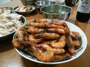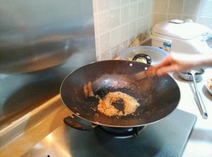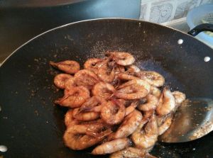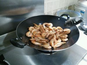 大火,用炸虾剩下的油适量,倒入姜蓉蒜蓉,爆炒至金黄色,然后倒入虾。