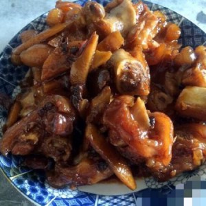 姜切片葱切段加油把猪蹄进行翻炒,至皮微黄有泡即可。