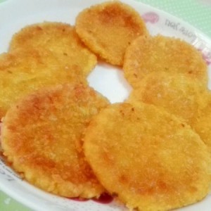 将压扁的面团放入面包糠中,让两面都均匀的沾上面包糠。也可以不加面包糠,但是有面包糠会让南瓜饼更香更酥脆哟!