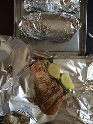 椒盐的加生姜葱包锡纸,放进烤箱烤30分钟,