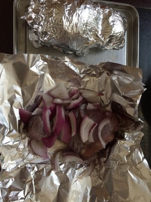 红酒的加洋葱,黄油用锡纸包好,放烤箱烤30分钟