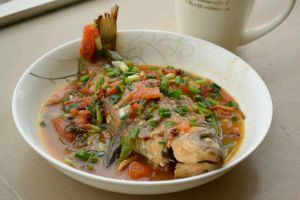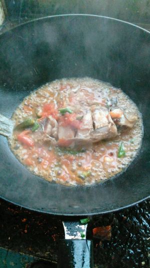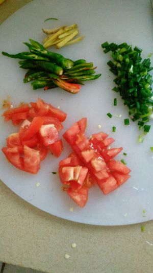 到油稍微可以多点油,怕沾锅,放鱼煎至微黄,翻过来煎另一面同时放入辣椒,姜,西红柿一起煎。鱼煎微黄,西红柿煎烂。加半碗水,改中火,加半勺糖,半勺生抽。