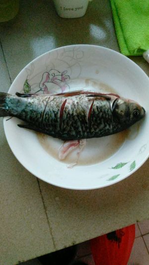 鲫鱼先在背部切三刀,然后抹点盐,里外都要抹到哦,有料酒可以加点料酒腌制几分钟。在准备别的材料,