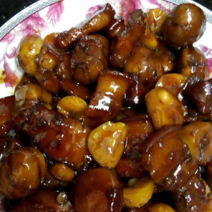 等水烧开放板栗,放一块红糖,水要没过肉和板栗,大火烧开后改小火焖30分钟。