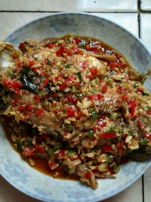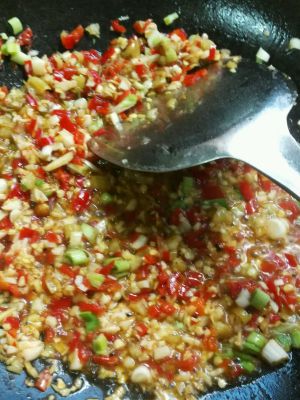 放入姜蒜剁椒蒜苗炒香,放入适量酱油调色,放入适量水煮开,把鱼放进锅里一起煮