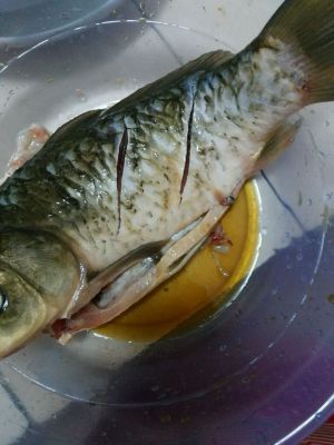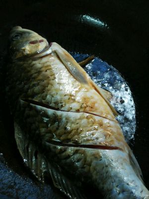 将洗好的鲫鱼两面划上几道口子,放入适量酱油和盐均匀涂抹,这样才不会粘锅