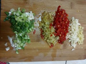 在腌制鲫鱼后,依次把姜蒜,青红泡椒,蒜苗都切好备用