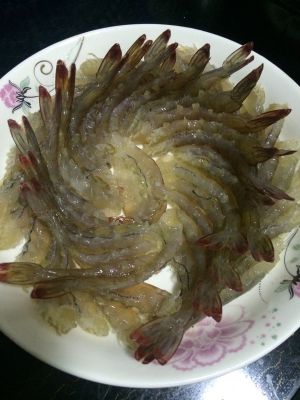 首先把虾洗干净,然后去掉脚,把头剥掉可以直接拉出虾肠一起去掉~这样干净点,有些虾肠挺脏的~不过其实酒店做的都没有去脚,没有去肠跟头~我是为了自己吃方便干净点~然后虾从肚子里开边,到尾的地方不要切断,切成一个“人”字,然后摆盘~