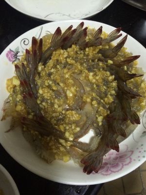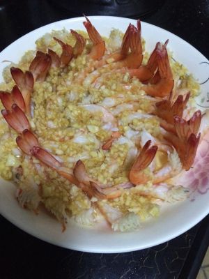 把调好的配料铺在虾肉上面~再倒点点油,然后放入锅中蒸熟,一般来说水滚后,蒸个6~7分钟都可以了