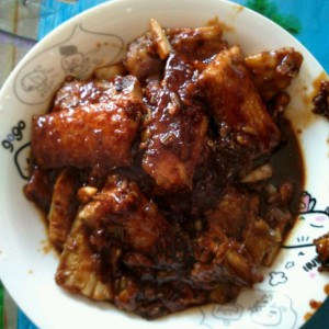 调糖醋汁:一碗水(喜欢汤汁拌米饭就适当一碗半至两碗水)老抽两汤匙,陈醋三汤匙,白糖一汤匙,料酒一汤匙