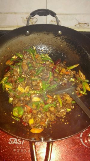 起锅留的油烧热,放入剁椒,大蒜,老姜,青花椒,干辣椒,爆炒出香味后加入兔丁爆炒,可加少许盐