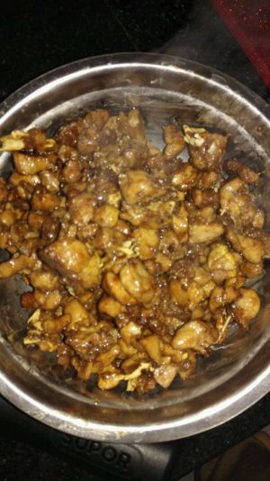 油烧热,放入兔丁,炒至颜色金黄起锅,一定要多油,不然容易粘锅,起锅后就少许油
