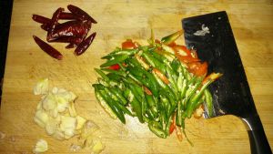 把小米辣,干辣椒,大蒜,老姜切好备用,另起锅烧油,最好菜籽油
