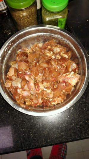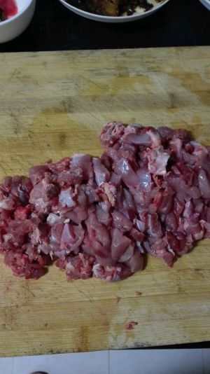 兔丁用料酒,白糖,盐,老抽,淀粉,胡椒粉腌制二十分钟,一定要搅拌均匀