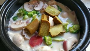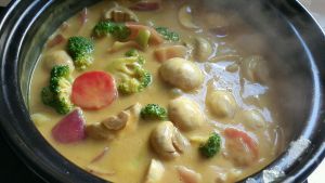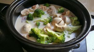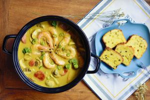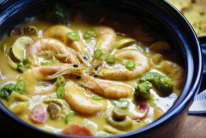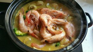 加入提前煮熟的虾,煮开后再转小火炖十分钟左右,撒上青椒即可~