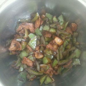 加老抽调味继续翻炒,多炒一会把青椒水分炒出来比较好吃,出锅前加少许盐即可