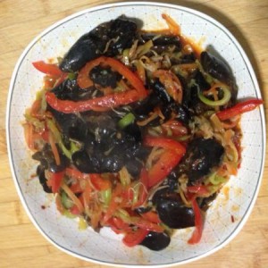 胡萝卜变色后倒入肉丝、彩椒和木耳翻炒