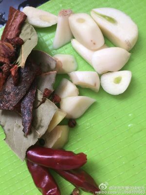 准备好香叶,桂皮,葱,姜,蒜,花椒,大料备用